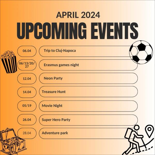 Get ready to mark your calendars because we've got an exciting lineup of events planned just for you in the coming weeks. From exciting trips to Erasmus games nights, parties that'll make memories, treasure hunts that promise awards, cozy movie nights, to adrenaline-pumping adventures at the park .